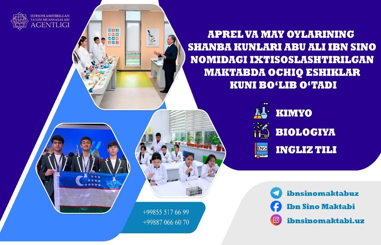 Hurmatli ota-onalar va kelajagimiz egalari bo’lgan o’quvchilar! Siz intizorlik bilan kutgan kunlar keldi. Abu Ali Ibn Sino nomidagi ixtisoslashtirilgan maktab barchangizni taklif etadi!
