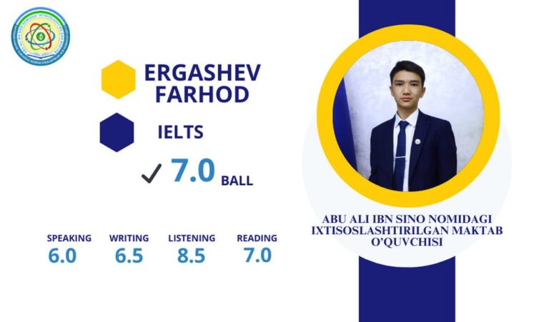 Abu Ali ibn Sino nomidagi ixtisoslashtirilgan maktabining 8-sinf o’quvchisi Ergashev Farhod IELTS
